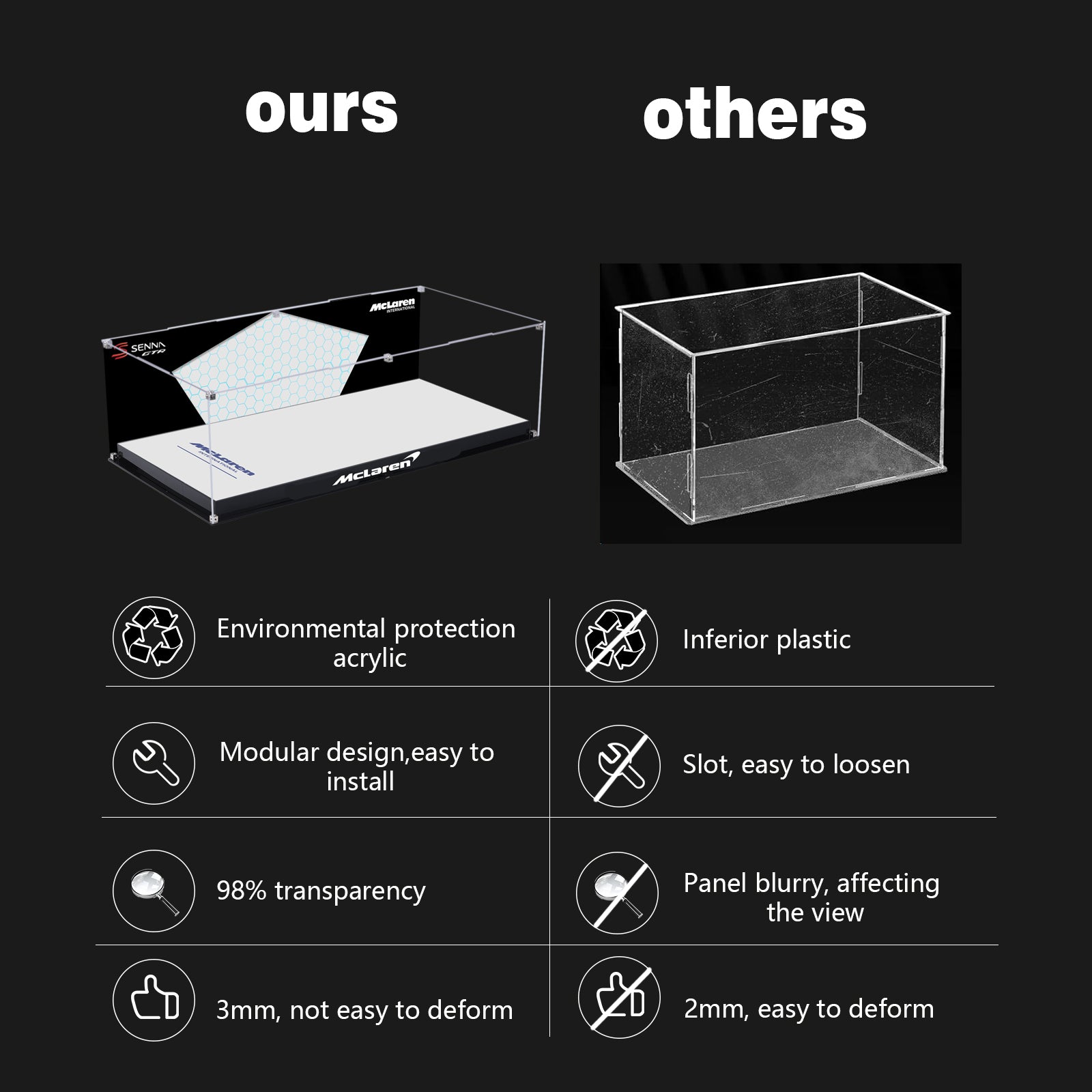 • Ultra-clear 3mm aviation-grade acrylic: 98% ultra-high light transmittance, showing every detail of the model.